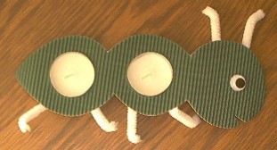Aus grüner Wellpappe die Raupe ausschneiden. Löcher für Teelichter ausschneiden, Wackelauge und aus weißem Pfeifenputzer Beine aufkleben.