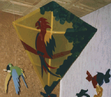 Aus den Leisten ein Kreuz binden und rings rum die Schnur spannen. Mit einem großen Bogen Transparentpapier umkleben. Je nach Geschmack mit weiterem Transparentpapier Motive aufkleben. Unten ein langes Stück Schnur für den Schwanz befestigen. Daran aus V oder Krepppapier Schleifen binden.