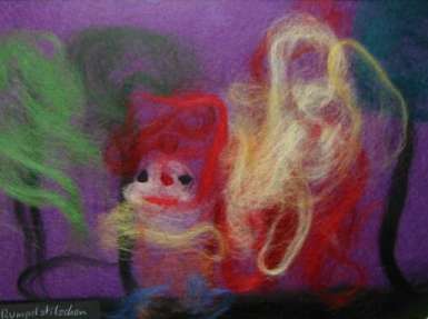 Der Filz/Jute wird auf dem Tisch ausgebreitet. Von der Märchenwolle zupft man kleine Faserstränge ab, die man dann entsprechend formt und einfach auf den Filz legt und andrückt. So verfährt man, bis das Bild fertig gelegt ist. Durch die verschiedenen Fasern verhakt sich die Märchenwolle auf dem Filz/Jute und hält so von alleine. Das fertige Bild gibt man dann vorsichtig in den Rahmen und kann es dann aufhängen.