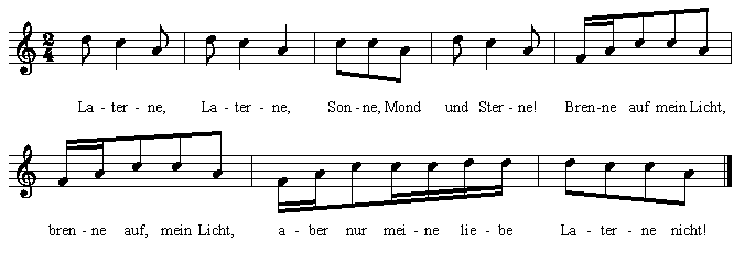| Laterne, Laterne, Sonne, Mond und Sterne. Sperrt ihn ein, den Wind, Sperrt ihn ein, den Wind, er soll warten, bis wir alle zu Hause sind!  | |