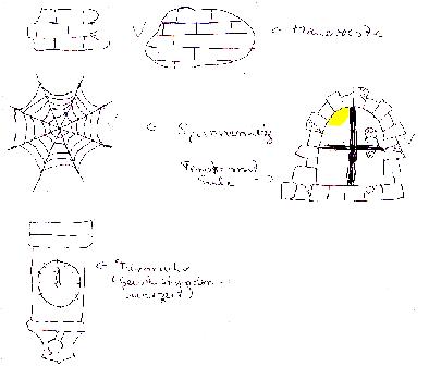Mit den Kindern bemalten wir Packpapier (mit schwarzer Fingerfarbe oder dickem Edding) mit Mauerresten, Spinnennetzen, einer Turmuhr, die 24 Uhr zeigte, und Fenster mit einer Eule. Diese wurden an den Wänden aufgehängt. |