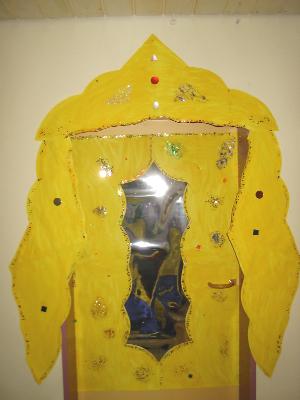 Unser Eingang zum Gruppenzimmer ist der Zauberspiegel. Die Kinder haben ihn bemalt und mit Glitzer frei gestaltet. Sie stehen oft davor und sagen das berühmte Sprüchlein …