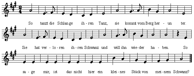 So tanzt die Schlange ihren Tanz und kommt vom Berg herunter. Sie hat verloren ihren Schwanz und will ihn wieder haben.