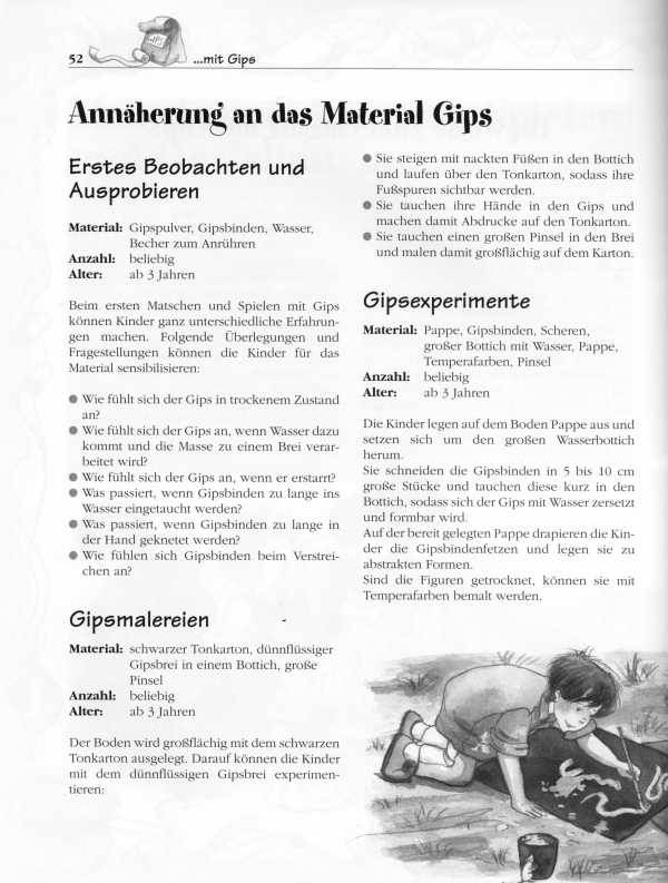 Matschen, Schmieren, Spielen und Gestalten mit verschiedenen Materialien Spiel nicht mit den Schmuddelkindern: Das Lied von Franz-Josef Degenhardt wird heute von vielen Eltern und sogar von manchen Kindern sehr wörtlich genommen – die Gesellschaft des Weißen Riesen hat ihr Möglichstes getan. Dennoch – Kinder haben eine angeborene Lust mit verschiedenen Materialien zu matschen, zu schmieren, zu planschen und zu kneten. Sie fühlen sich von matschigen, lehmigen Pfützen magisch angezogen: Mit Begeisterung springen sie mit beiden Füßen hinein und freuen sich an den vielen weiten Spritzern oder sie bohren ihre Gummistiefel in ein Matschloch, um zu sehen, wie tief es ist. Damit Kinder dieses elementare Bedürfnis ausleben können, stellt das Buch zahlreiche Möglichkeiten vor, mit verschiedensten Materialien wie Sand, Ton, Wasser und Seife, Teig oder Papier zu experimentieren. Da wird mit Tonschlicker gematscht, mit Fingerfarben gespritzt, Körperteile mit Gips verschmiert und die Papierpulpe geknetet. Aus Schnee und Eis entstehen Iglus und Riesenwindlichter, aus Lehm und Draht abstrakte Matsch-Plastiken – wer wird da nicht zum Schmuddelkind! |