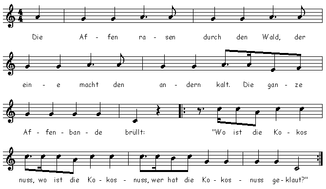 | Das Affenbaby voll Genuss, hält in der Hand die Kokosnuss. Die ganze Affenbande brüllt: "Da ist die Kokosnuss, da ist die Kokosnuss, es hat die Kokosnuss geklaut!" | |