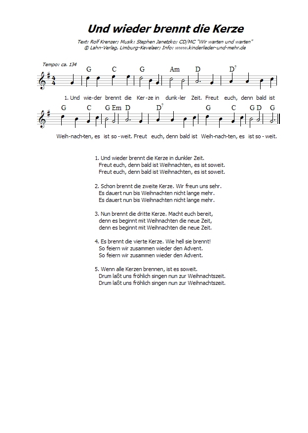 15 Lieder für Advent und die Winterzeit: „Wenn wir Weihnachtsplätzchen backen“, „Und wieder brennt die Kerze“, “Singt mit uns von der Weihnachtsnacht”, “Nikolaus” u. a. Texte von Rolf Krenzer. Buch: Texte + Noten zu 10 Liedern, 4 Geschichten, 1 Weihnachtsspiel. |
