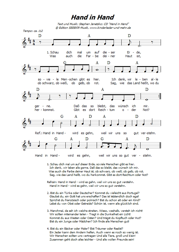 20 Mutmachlieder für starke Kinder. Mit “Hand in Hand”, “Kinder können mehr”, “Frühlingslied”, “Immer wieder geht die Sonne auf”, “Egal, welche Sprache du sprichst”, “´Tschuldigung”, “Ich schenk dir eine rote Rose”, “Wenn ich ein kleines Vöglein wär” u.v.a.m., mit CD-Extra inkl. Texte, Texte mit Gitarrengriffen, Noten mit Gitarrengriffen und ggf. Spielanregungen (3 PDF-Dateien). |