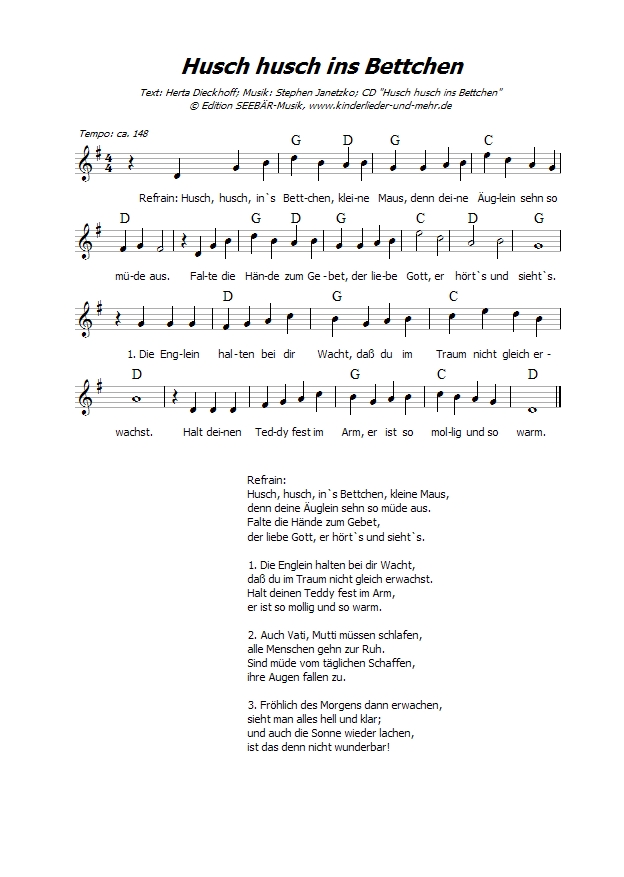20 Gute-Nacht-, Abend- und Laternenlieder, mit “Ich bin müde”, “Komm, mein kleines Kätzchen”, “Stille ist es bei den Schafen”, “Leise, leise, leise”, “Husch husch ins Bettchen”, “Gute Nacht-Lied”, “Alle braven Kinder schlafen”, “Meine Laterne” u.v.a.m., mit CD-Extra inkl. Texte, Texte mit Gitarrengriffen, Noten mit Gitarrengriffen und ggf. Spielanregungen (3 PDF-Dateien). |