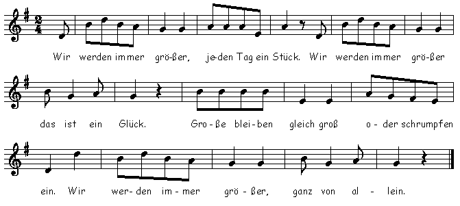| Wir werden immer größer, jeden Tag ein Stück. Wir werden immer größer, das ist ein Glück. Große bleiben gleich groß oder schrumpeln ein: Wir werden immer größer ganz von allein! | |