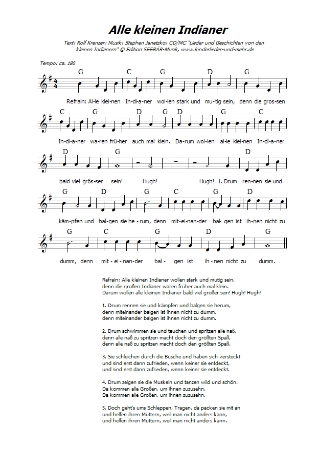 Über 5.500 verkaufte Tonträger, über 8.500 verkaufte Bücher! 10 Indianerlieder von Stephen Janetzko + 5 Indianergeschichten, gelesen von Rolf Krenzer: „Medizinmann Eulenblick“, „Alle kleinen Indianer“, “Der Büffeltanz”, “Mein kleiner Indianer”, “Indianeraugen” u. a. Buch: Lieder, Geschichten, Indianerspiele, Bastelanregungen u. a. |