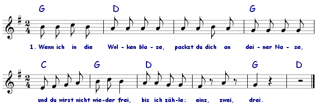 1. Wenn ich in die Wolken blase, packst du dich an deiner Nase,