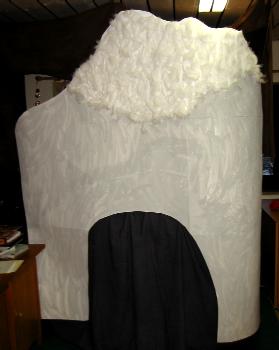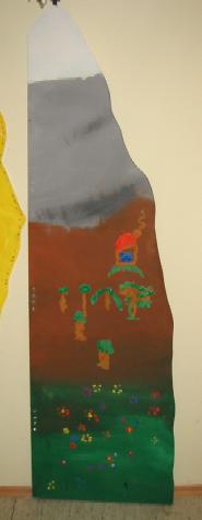 Unser Zivi hat aus Sperrholz für den Gang Berge gesägt. Diese sind an der Wand befestigt und sogar zum Umklappen (wegen der Putzfrau). Er hat sie mit den Kindern gestaltet.