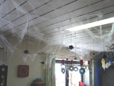 Dann wollten die Kinder noch etwas grusliges, so wie die Hexenküche der Stiefmutter. Wir haben uns auf Spinnweben über dem Maltisch geeinigt, die auch super aussehen. Auf Wunsch der Kinder haben wir dann noch Spinnen gebastelt: Wollpompom gewickelt, Füße aus Pfeifenputzer durchstecken, Augen gestalten.