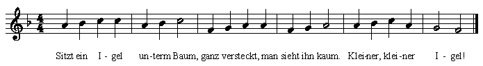 | Sitzt ein Igel unterm Baum, ganz versteckt, man sieht ihn kaum. Kleiner Igel, kleiner Igel! | |